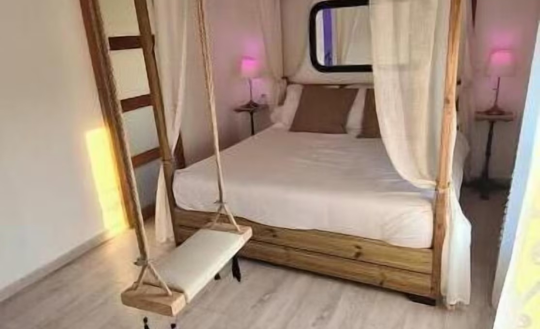 À l’étage, la grande chambre dévoile un lit à baldaquin King Size avec une joli balançoire bohème pour une pause romantique. Au rez-de-chaussée, le séjour est tout en élégance avec ses meubles design et son ambiance contemporaine. Le canapé en cuir, convertible en couchage, invite déjà à la complicité. Face à lui, la télévision avec accès à Netflix permet de varier les plaisirs.